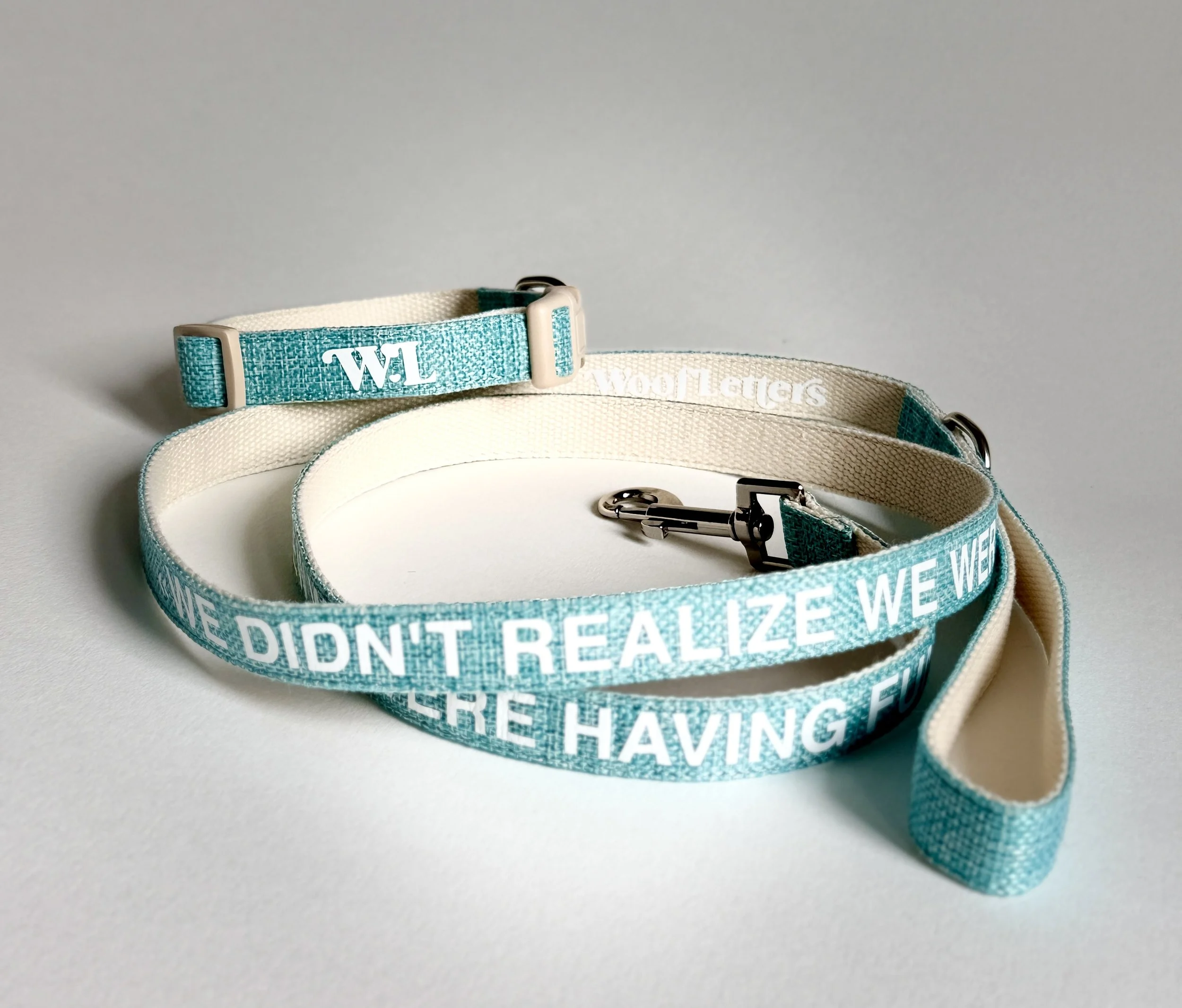 The leash comes in white on turquoise.